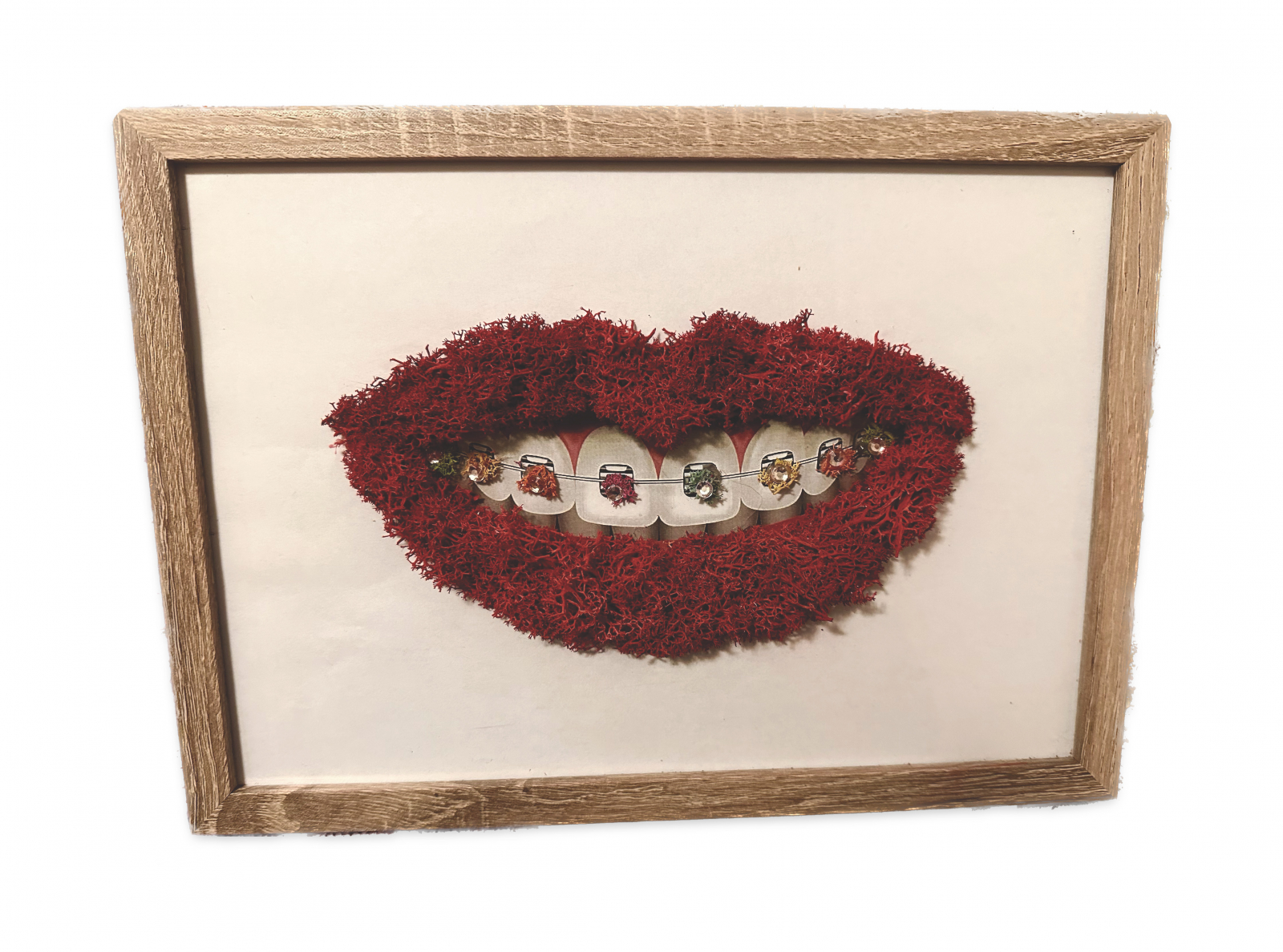 Decoratiune rama foto lemn cu lichieni si pietricele, model “Aparat dentar”